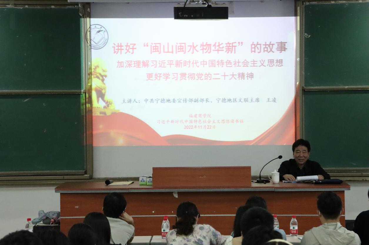 闽山闽水物华新,“习言习语”催人进。11月22日晚,中共宁德地委宣传部原副部长、原宁德地区文联主席王凌研究员受邀莅临公司,为公司师生作了题为《讲好“闽山闽水物华新”的故事,加深理解习近平新时代中国特色社会主义思想,更好学习贯彻党的二十大精神》的专题讲座。公司党委副书记吴访益,z6mg人生就是博、机关党委负责同志,公司习近平新时代中国特色社会主义思想员工读书社、教职工读书社社员代表参加。