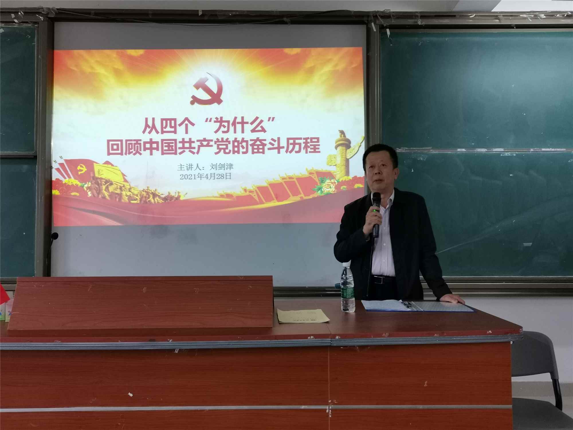 课堂中,刘剑津用丰富的史料及生动的历史事件,从中国共产党坚定地捍卫国家民族利益、解决了农民土地问题、实行普遍民主、高度廉洁四个方面分析了中国共产党为什么能够建立新中国;从政治上建立了各级人民民主政权,经济上恢复了被多年战乱破坏的国民经济,外交上荡涤了帝国主义的污泥浊水以及国防上打赢了抗美援朝战争,他阐释了为什么中国共产党能够收拾好国民党留下的烂摊子;从领导层能够与老百姓同甘共苦,能够不断总结经验与教训,始终以人民为中心,解读了为什么中国共产党能够得到人民的支持;从坚持解放思想、坚持深化改革、坚持对外开放总结了为什么中国共产党能够取得现代化建设的巨大成就。刘剑津表示,回顾中国共产党百年奋斗历程可以看出我们的党是有远大理想追求的党、有科学理论引领的党、有选贤任能机制的党、有自我革命精神的党。