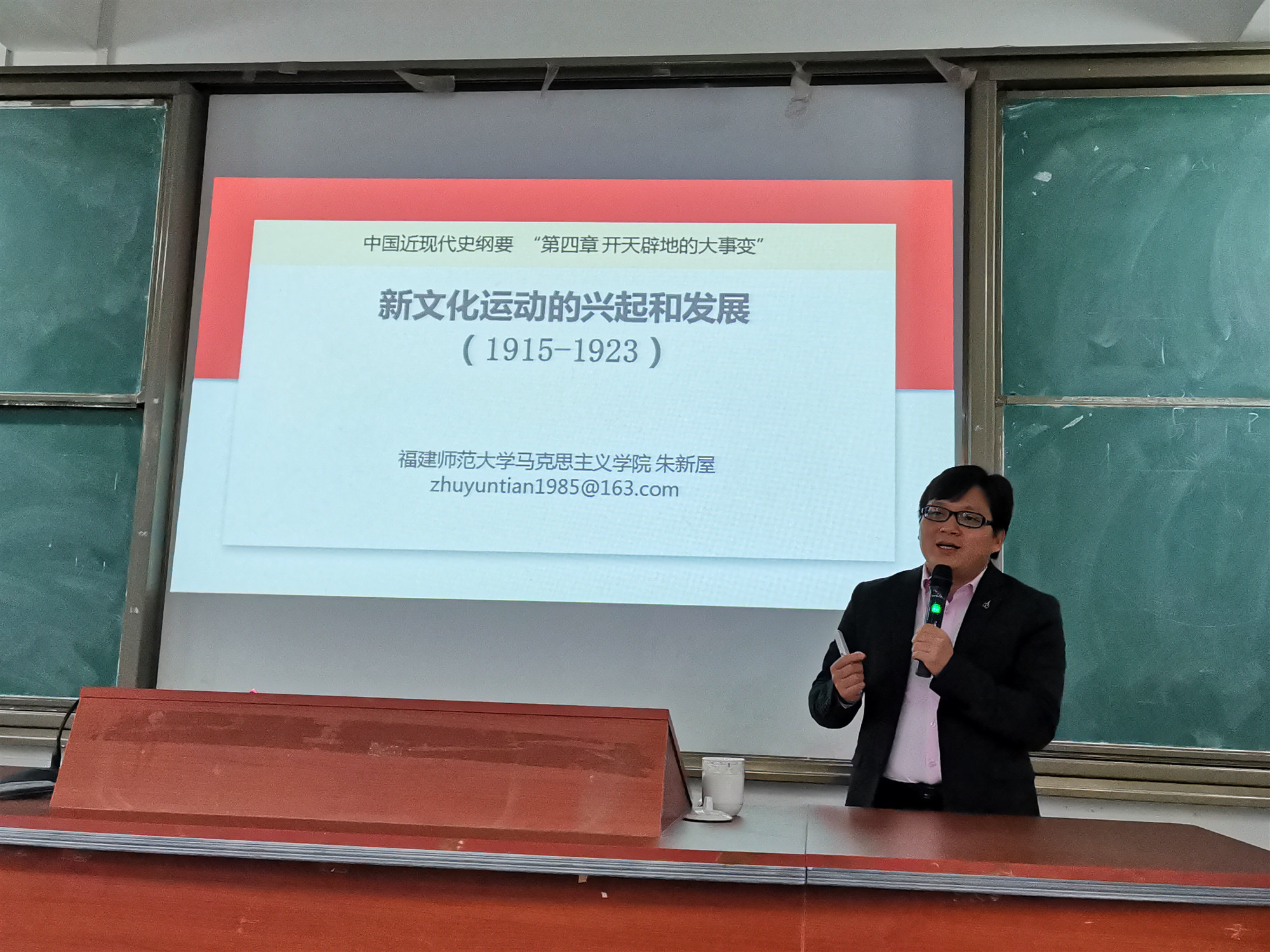 2020年12月14日,福建省高校青年教学名师福建师范大学朱新屋副教授应邀到公司作题为”新文化运动的兴起和发展(1915—1923)”的示范教学。z6mg人生就是博部分教师以及2020级数据科学与大数据技术1、2班员工参加学习。