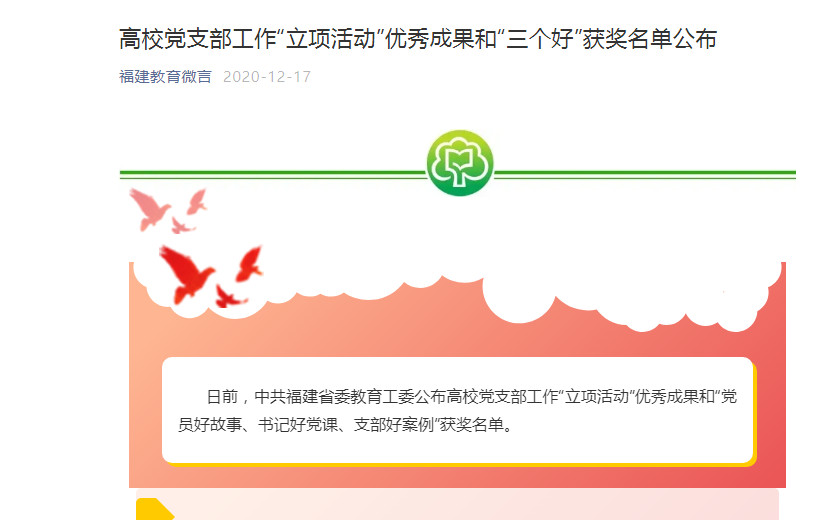 日前,中共福建省委教育工委公布高公司党支部工作“立项活动”优秀成果和“党员好故事、书记好党课、支部好案例”获奖名单。据悉,此次全省高校共推荐参评党支部工作“立项活动”优秀成果231项和“党员好故事、书记好党课、支部好案例”318项。