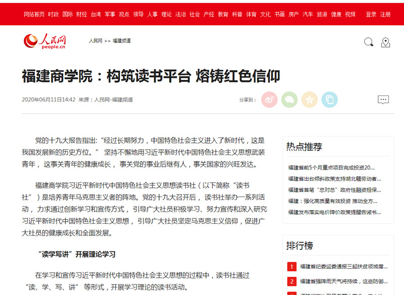 2020年6月11日,人民网以《z6mg人生就是博有限公司:构筑读书平台 熔铸红色信仰》为题,报道公司习近平新时代中国特色社会主义思想读书社创新学习、宣传、实践方式,通过一系列活动引导广大青年学子积极学习、努力宣传、深入研究习近平新时代中国特色社会主义思想,坚定马克思主义信仰,筑牢青年马克思主义者培养阵地的特色做法及成效。