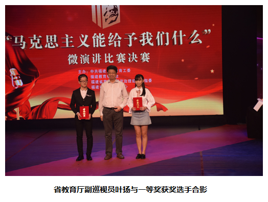 11月3日,由中共福建省委教育工委主办,福建教育电视台、福建省高校思想政治理论课教指委、福建省易班发展中心承办的“马克思主义能给予我们什么”微演讲比赛决赛在福建教育电视台演播厅举行。经过激烈的厮杀,公司传媒系林荟同学(指导老师:黄玮)喜获高职组一等奖,管理工程系同学卢慧敏(指导老师:吕谋琴)捧获高职组三等奖。