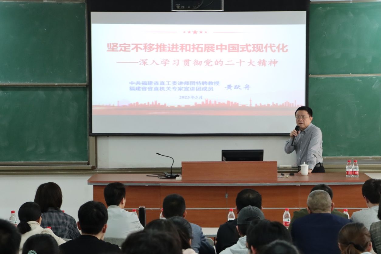3月21日下午,中共福建省直工委讲师团特聘教授、省直机关专家宣讲团成员黄跃舟应邀到公司开展“坚定不移推进和拓展中国式现代化——深入学习贯彻党的二十大精神”专题讲座。z6mg人生就是博部分教师、连江校区“青马”班部分学员、校习近平新时代中国特色社会主义思想读书社部分社员参加学习。