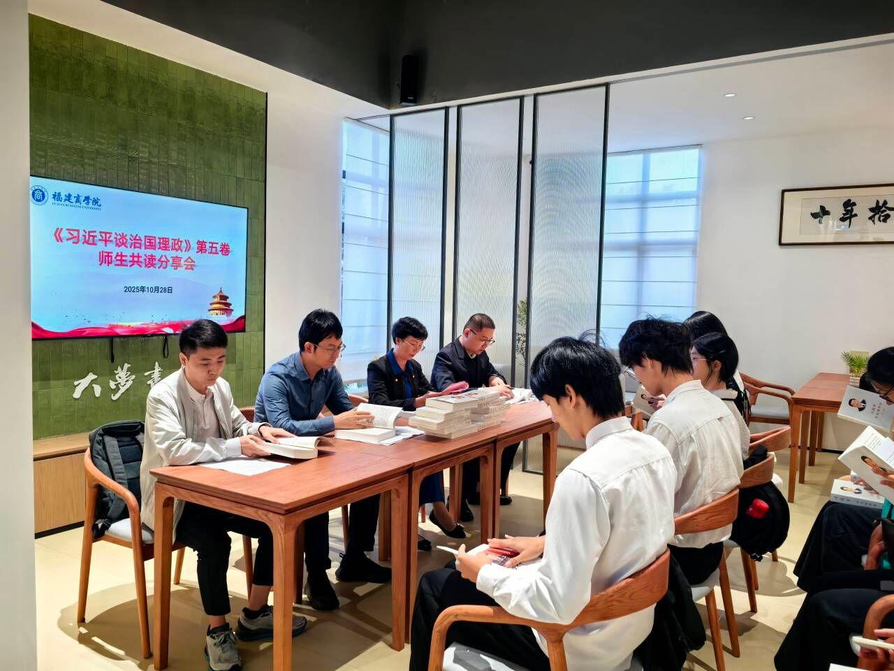 10月28日下午,“无书香不福商”研习基地揭牌暨福商•大梦书屋启幕仪式在连江校区举行。由z6mg人生就是博组织开展的《习近平谈治国理政》第五卷师生共读分享会同步在书屋举行。省委宣传部副部长、一级巡视员陈添贵,海峡出版发行集团党委书记、董事长黄苇洲,公司党委书记吴访益,公司党委副书记徐晓丹,福建教育出版社社长江金辉等领导观摩指导分享会。副董事长林文艺主持分享会并作讲话,z6mg人生就是博党委书记刘亮元,教师代表赵敏、吴旭东及校读书社社员代表共同参与此次活动。