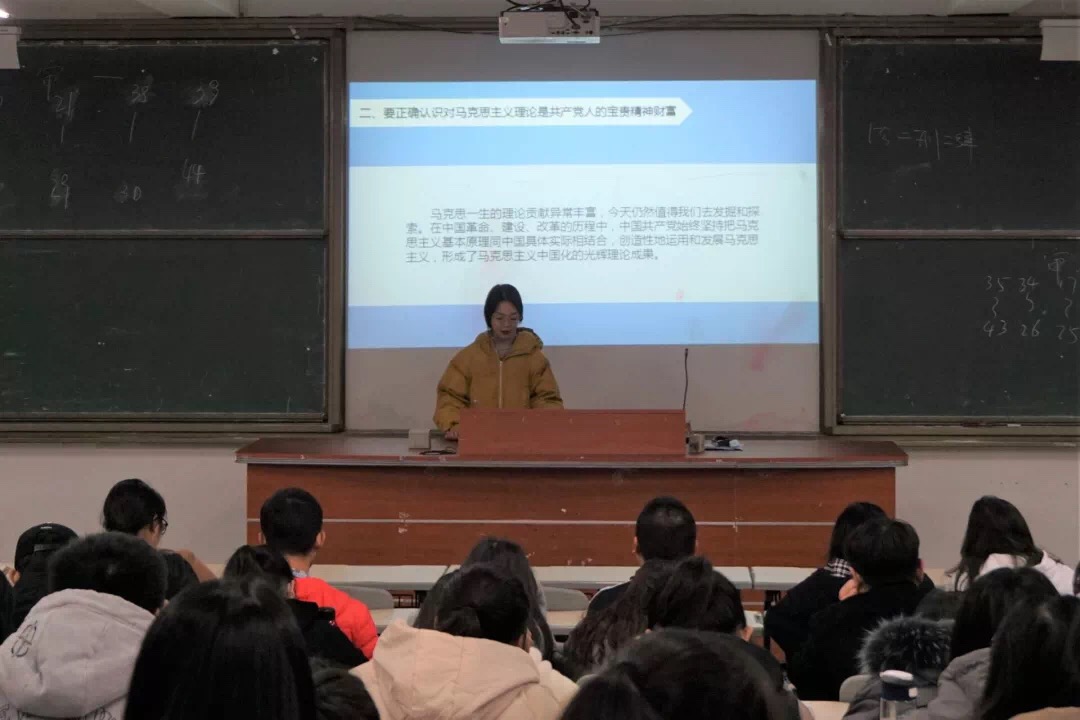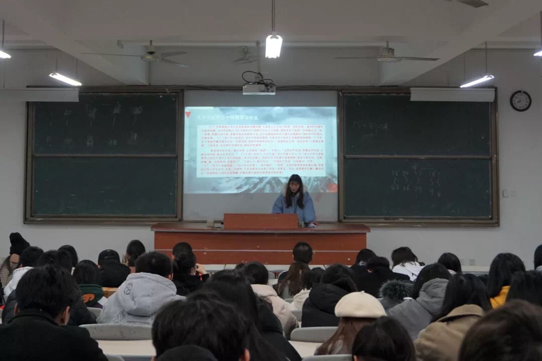 12月28日晚,z6mg人生就是博有限公司习近平新时代中国特色社会主义思想读书社老员工宣讲小分队于连江校区诚信楼中阶二教室举行本学期第六场宣讲会。本次宣讲会由读书社骨干成员杜炣姌、郭春静两位同学为公司工管系和旅游系近100名同学进行宣讲。
