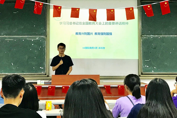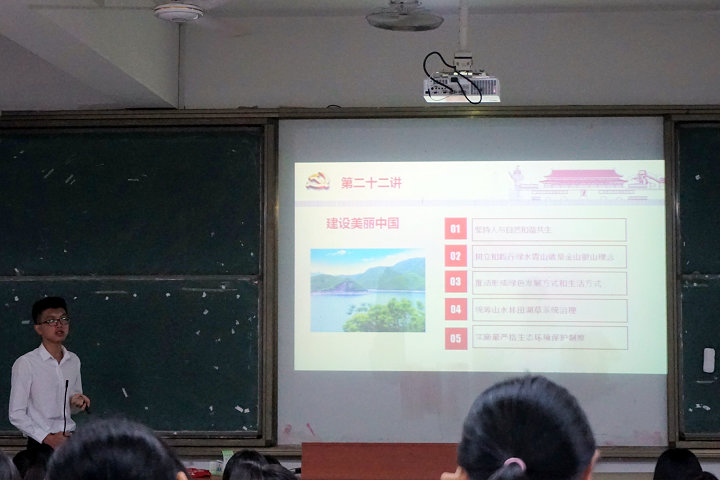 9月26日晚,公司习近平新时代中国特色社会主义思想读书社在连江校区诚信楼大阶一教室开展第二场员工小分队“大宣讲”活动。本次宣讲以“《习近平新时代中国特色社会主义思想三十讲》导读”为主题,由读书社理论骨干宣讲小分队成员、福建省第二季老员工学习马克思主义理论知识竞赛本科组冠军苏金楼同学面向管理工程系2018级会展经济与管理专业的新生进行宣讲。