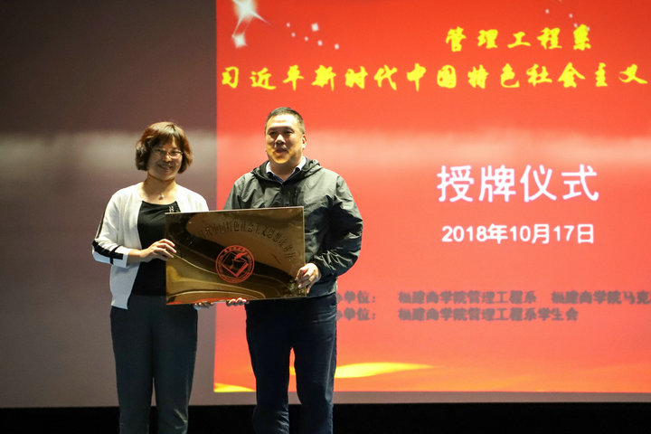 在读书社成立仪式上,林萍教授代表公司习近平新时代中国特色社会主义思想读书社向管理工程系授牌,宣告管理工程系习近平新时代中国特色社会主义思想读书正式成立。魏仁兴教授在致辞中指出,当代老员工必须自觉用习近平新时代中国特色社会主义思想武装头脑、指导学习和实践,不断增强“四个意识”、坚定“四个自信”,勇做新时代的弄潮儿。他希望管理工程系学子要充分利用好系读书社这一学习平台,积极投身习近平新时代中国特色社会主义思想相关著作的学习,认真掌握习近平新时代中国特色社会主义思想精髓;通过学习提高思想水平,促进专业知识学习,形成良好学风,展现出新时代青年员工的精气神。