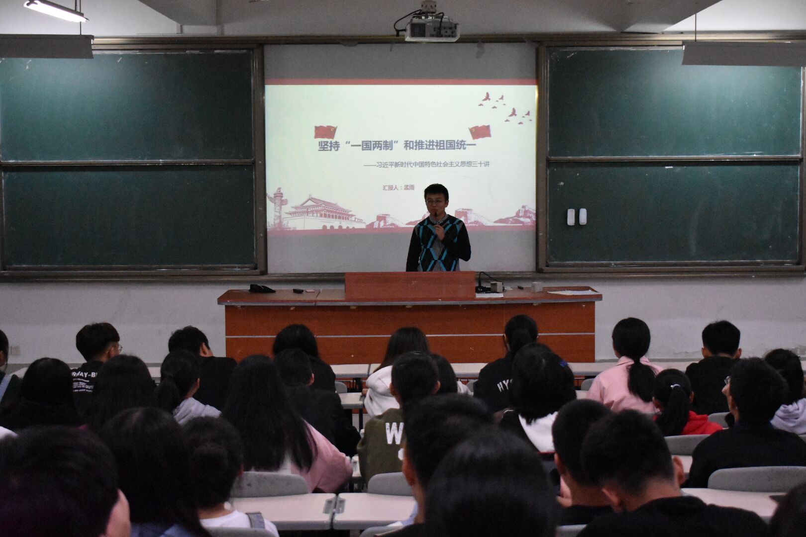 在宣讲活动上,陈安琪同学首先围绕“五四精神,永垂不朽”这一主题,深入剖析了五四运动对中国共产党的产生、发展有深远影响,让同学们充分认识到中国共产党党史与五四精神的重要性。陈安琪同学指出,习近平总书记在北京大学的师生座谈会给我们的启迪是鼓舞人心的;作为当代老员工,我们有责任坚持五四精神,传承五四思想。随后,孟雨同学以《习近平新时代中国特色社会主义思想三十讲》一书中的核心内容作为主要依据,展开对坚持“一国两制”和推进祖国统一的探讨。一国两制,即“一个国家,两种制度”,是中国政府为实现国家和平统一而提出的基本国策。坚持“一国两制”和推进祖国统一是实现中华民族伟大复兴的必然要求。孟雨同学列举西藏与印度交接处领土仍被占领、新疆和西藏两自治区交界处的土地争端、南海问题以及“台独”问题等例子,表明了我国和平统一的目标尚未完全实现,继续坚持“一国两制”原则为政治基础,坚决维护国家主权和领土完整,继续推进两岸各领域交流合作,为两岸同胞谋福祉既是我们的使命,也是我们的初心。
