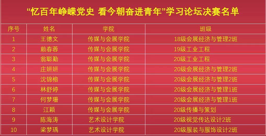 此次活动一共评选出10位选手进入学习论坛决赛。具体名单如下: