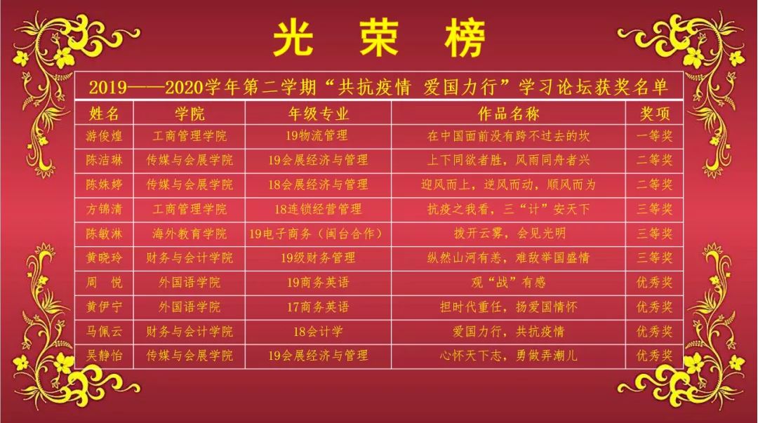 参赛选手围绕主题讲述抗击疫情中以医务人员为代表的各条战线彰显的“逆行者”精神和身边坚守一线、不怕牺牲、救死扶伤、无私奉献的英雄故事;宣传莘莘学子从我做起、加强自律、为社区服务、为群众分忧的青春故事。参赛选手的演讲紧扣主题、内容多样、角度新颖,有的讲述“逆行者”故事,生动感人;有的分享身边典型,激发大家共鸣;有的抒发爱国情感,引发师生思考。本次线上学习论坛历时一个多月,经过初赛、复赛、决赛的激烈角逐,共评选出10个获奖作品,工商管理公司19级物流管理专业游俊煌同学获得本次学习论坛一等奖,19级会展经济与管理专业陈洁琳等2位同学获得二等奖,18级连锁经营管理专业方锦清等3位同学获得三等奖,19级商务英语专业周悦等4位同学获得优秀奖。